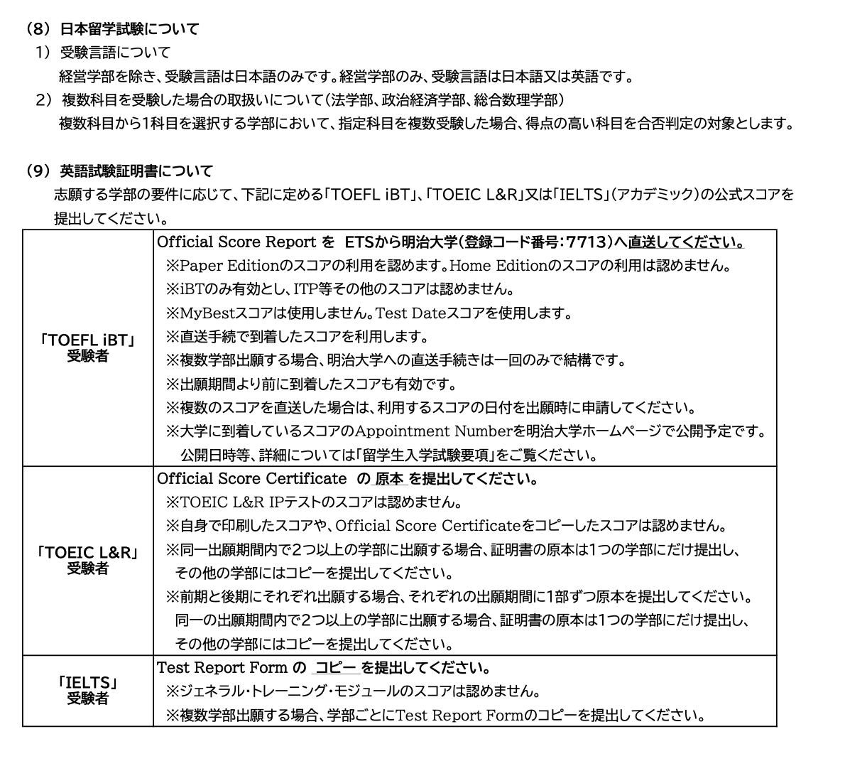 商学部:TOEFL iBT ≥48或TOEIC L&R ≥600o国际日本学部:TOEFL iBT ≥48、IELTS ≥4.0、TOEIC L&R ≥600