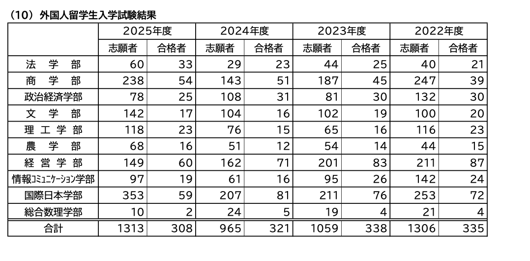 2025年度所有学部合计,总志愿者为1,313人,合格者为308人,整体录取率为约23.5%,意味着约每4位考生中便有1位被录取。
