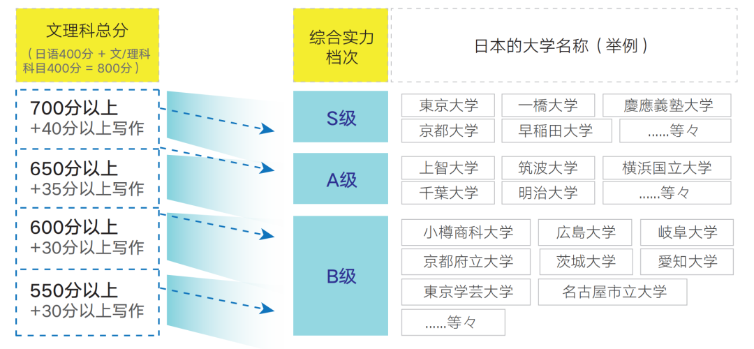 以上便是我们对于2023年6月份EJU考试的备考建议啦,下面放一个日本各大学的留考成绩对照表,大家可以根据这个先悄悄定个小目标喔~
