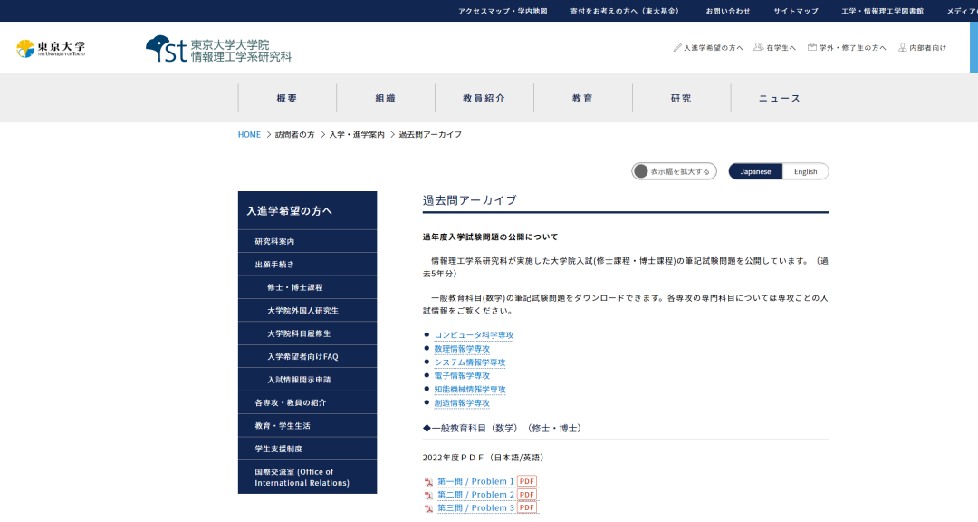 官网主页一般由 专攻主页 -> 入试情报 -> 大学院入試問題 进入。