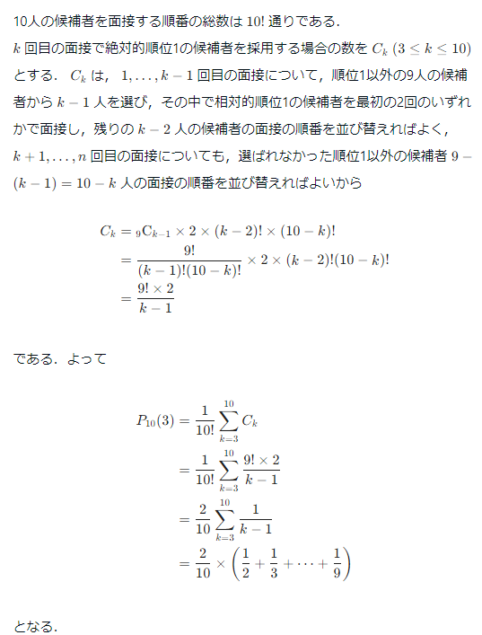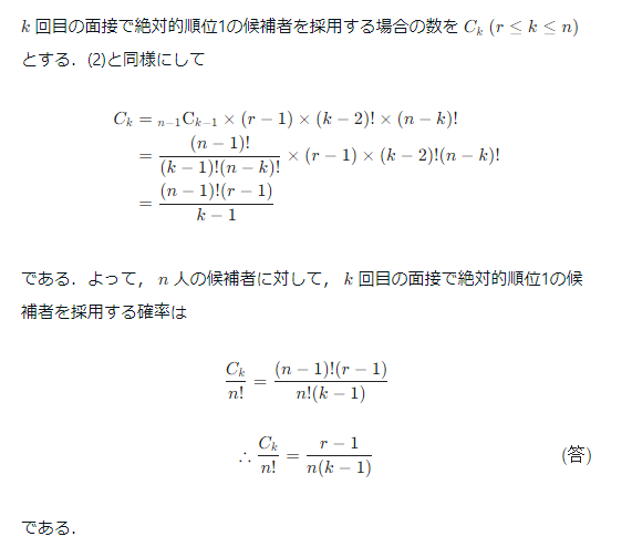 首先计算出第k次面试时候,第一号面试绝对排名为第一的招聘案例数。计算完成之后可以得出,在有n人的时候,对于一名候选人, 在第ķ次的面试的时候,第一号候选人的采用概率。