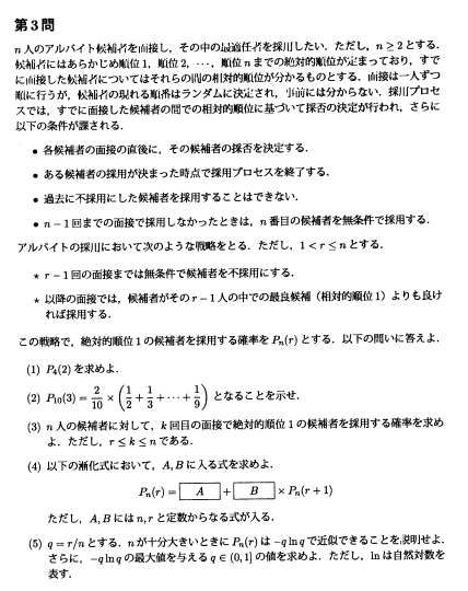 本题就是一道比较经典的排列组合和概率统计的问题,但是东京大学东京大学情報工学系研究科对概率统计的要求主要在概率部分,很少涉及到统计部分的考题。争对概率部分,经常会结合实际的问题来进行考核,需要考生将问题拆分后进一步分析。因此在备考的过程中要加强对典型题目的分析。