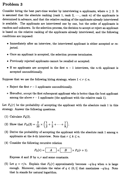 这道题是一个基于秘书问题(婚姻问题)的概率问题。如果我们采取无条件拒绝所有候选人的前 37% 的策略,然后在后续面试中的候选人比他们好时再聘用他们,那么绝对概率(37%)最高。排名 1 可以采用(但 n很大)