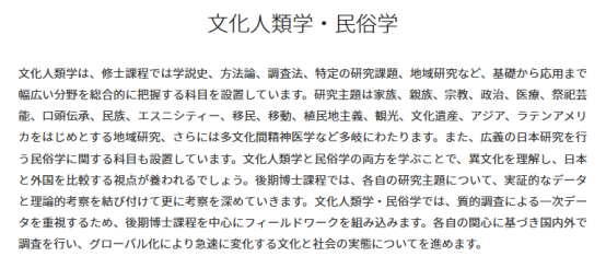 ※想更多了解东北大学文化人类学的同学可以点击下述链接,进入到东北大学文化人类学研究室的官网,可以看到详细的课程内容、教授信息、在籍学生等信息。