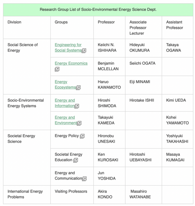 社会环境能源科学系(SES)里主要再分四个方向,能源社会科学,社会环境能源系,社会能源科学,国际能源问题(仅客座教授),细分8个核心小组,都有一个教授坐镇,部分有副教授作为讲师。