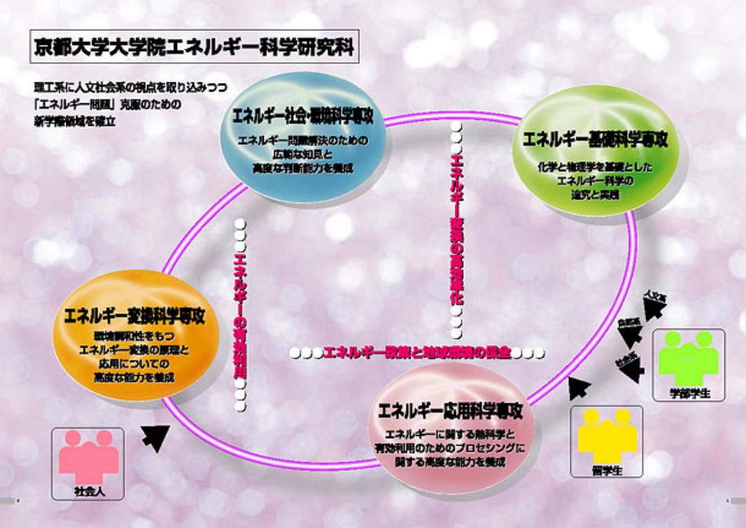 京都大正在努力通过建立能源科学理论来发展一个可持续的能源社会,所以京都大学的能源科学研究生院是能源科学以及一个将人文观点纳入科学和技术的跨学科领域,旨在培养那些为全球社会的和谐共处做出贡献、具有国际视野和各种专业高水平能力的人。