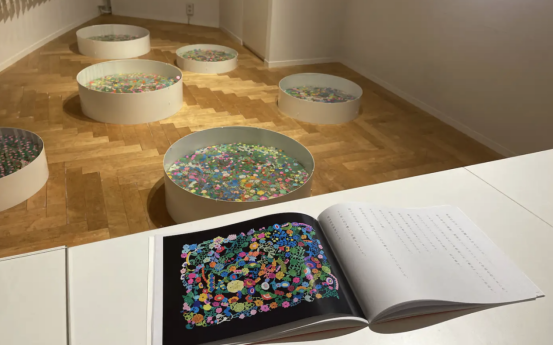 “room f”是以2021年去世的渡边的「母亲」为中心的作品展示。展厅里静静地摆放着渡边母亲去世前三周母女之间的对话的册子,以及从渡边与姐姐一同创作的的刺绣作品,还有用剪纸创作的鲜花作品。