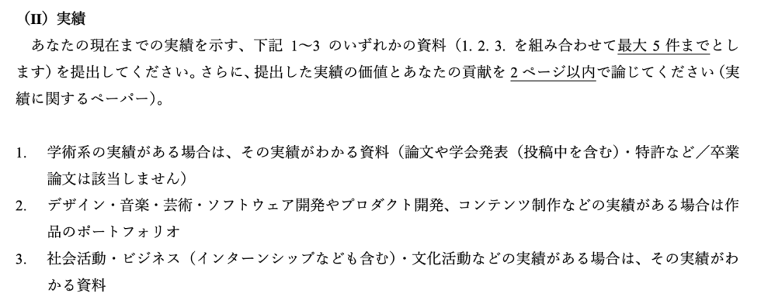 以及在回答web回答书的时候需要登陆「実績」,由以下3个项目组成,最大可以填写5个项目,分别是学术发表、艺术设计、社会活动,大家可以根据自己的经历来详细安排,并且在A4两页纸之内。
