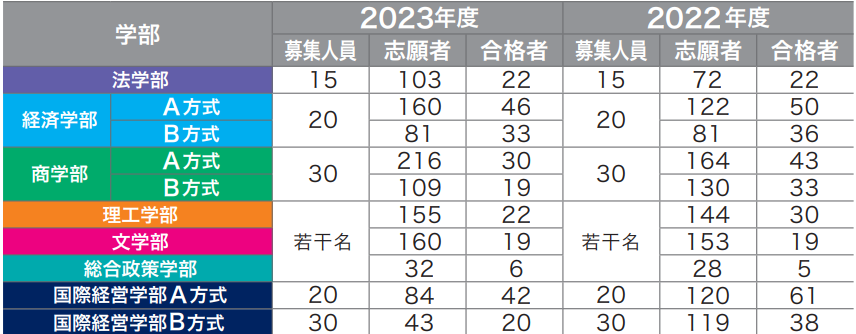 法学部招收15人。经济学部招收20人。商学部招收30人。理工学部招收若干人。文学部招收若干人。综合政策学部招收若干人。国际经营学部招收20人。
