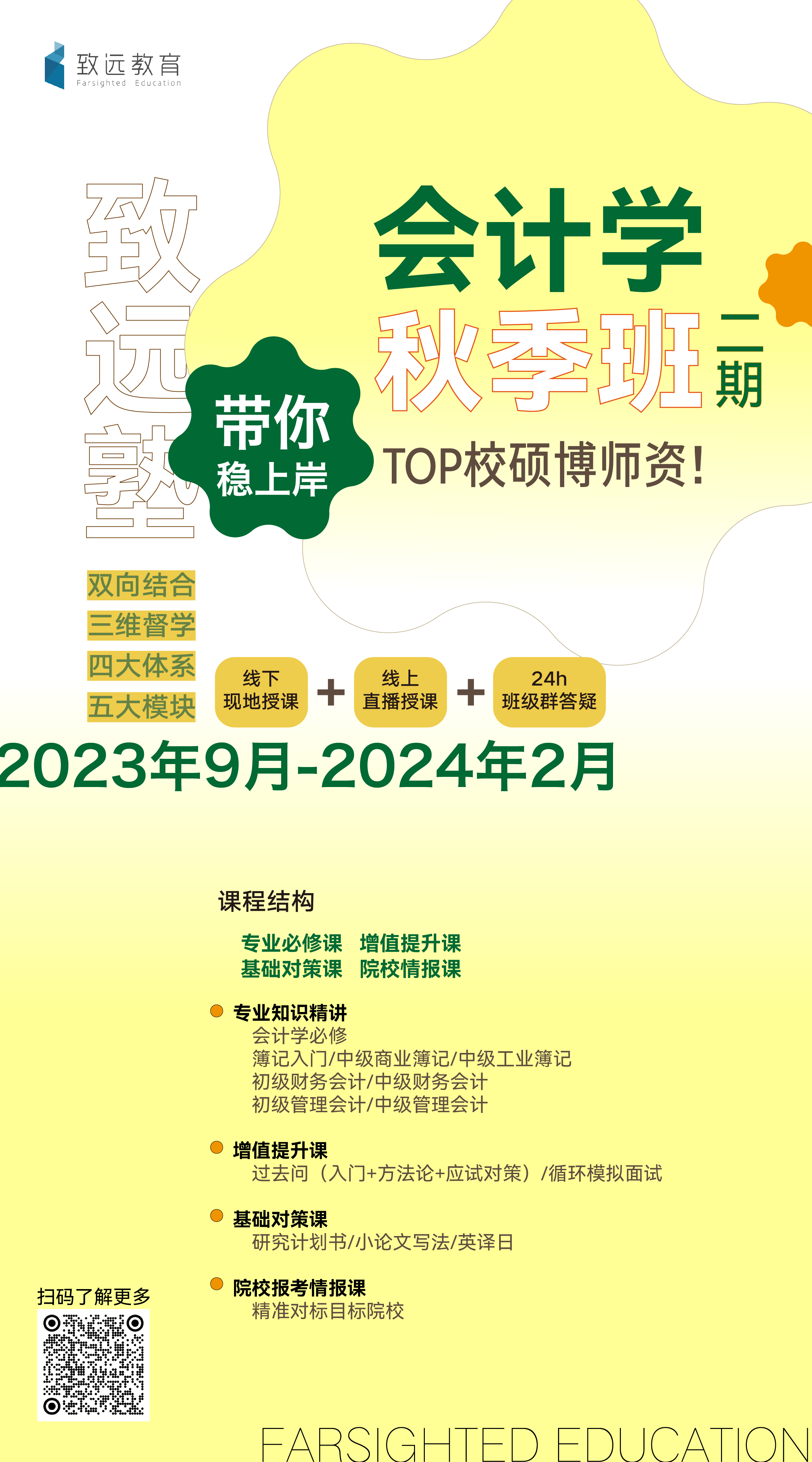 它来啦! 9月,致远会计学大学院2023年秋季班二期将正式亮相与大家见面!本期课程将历时半年,从9月到次年2月,经历春秋,为大家解决“大学院入试”这一备考难关!