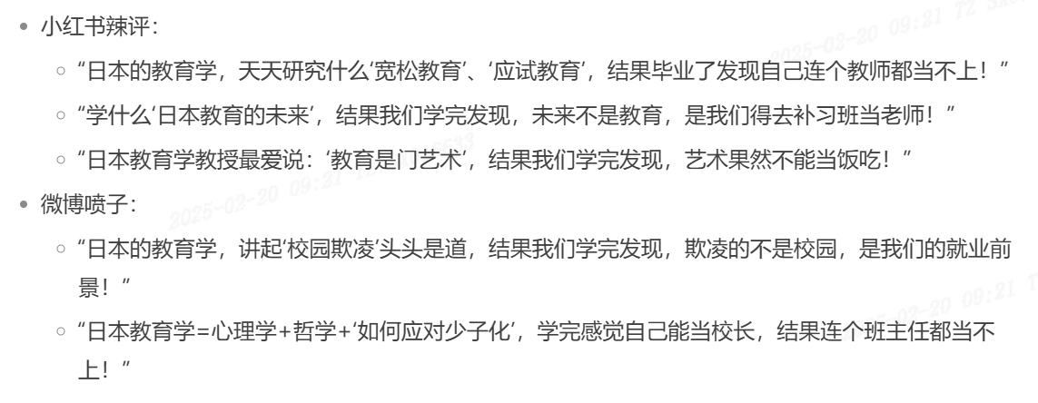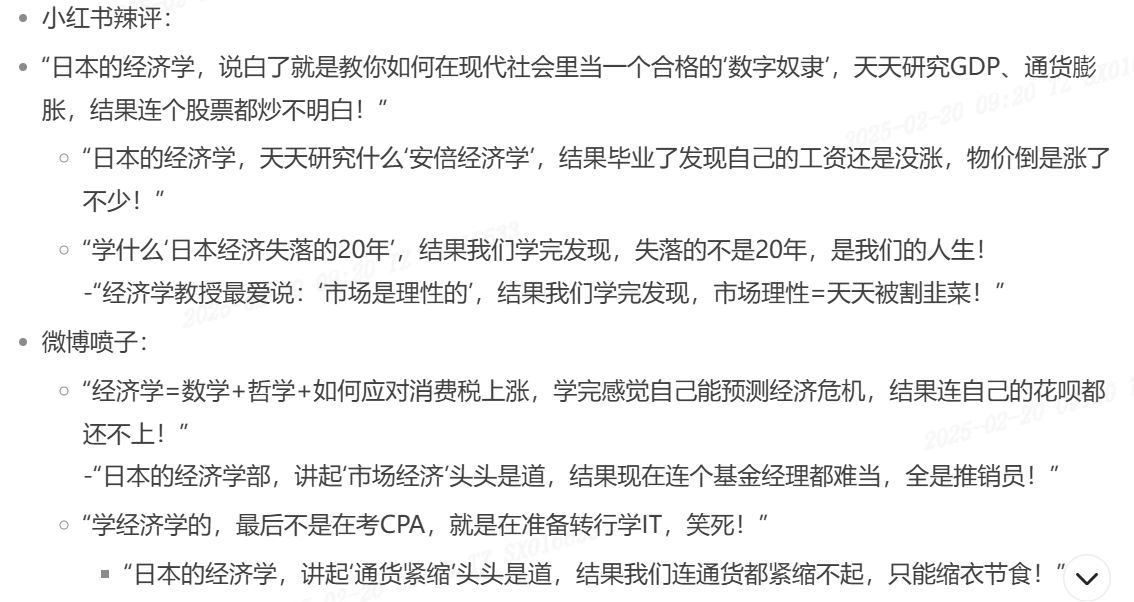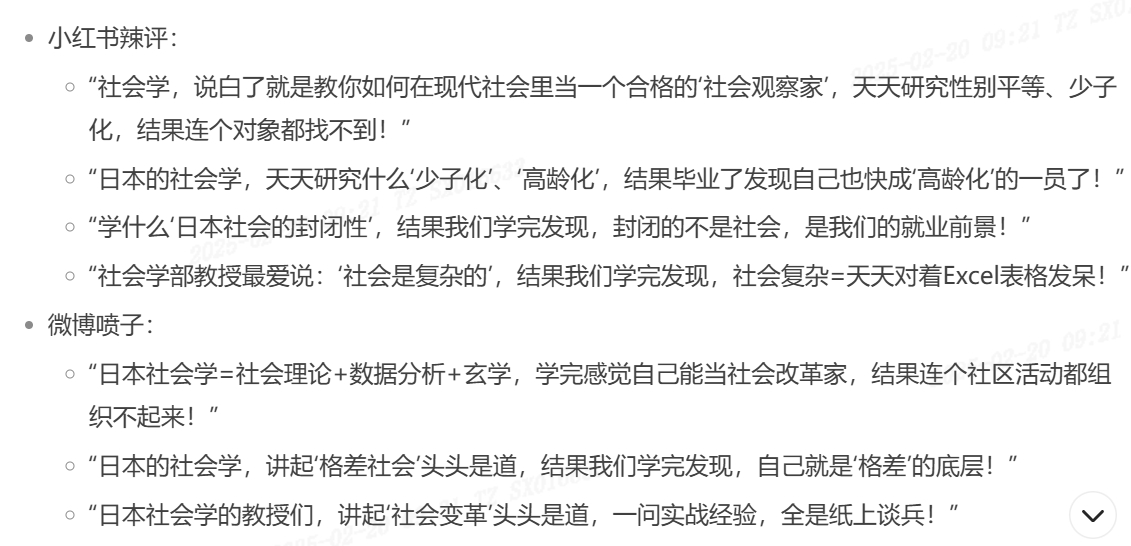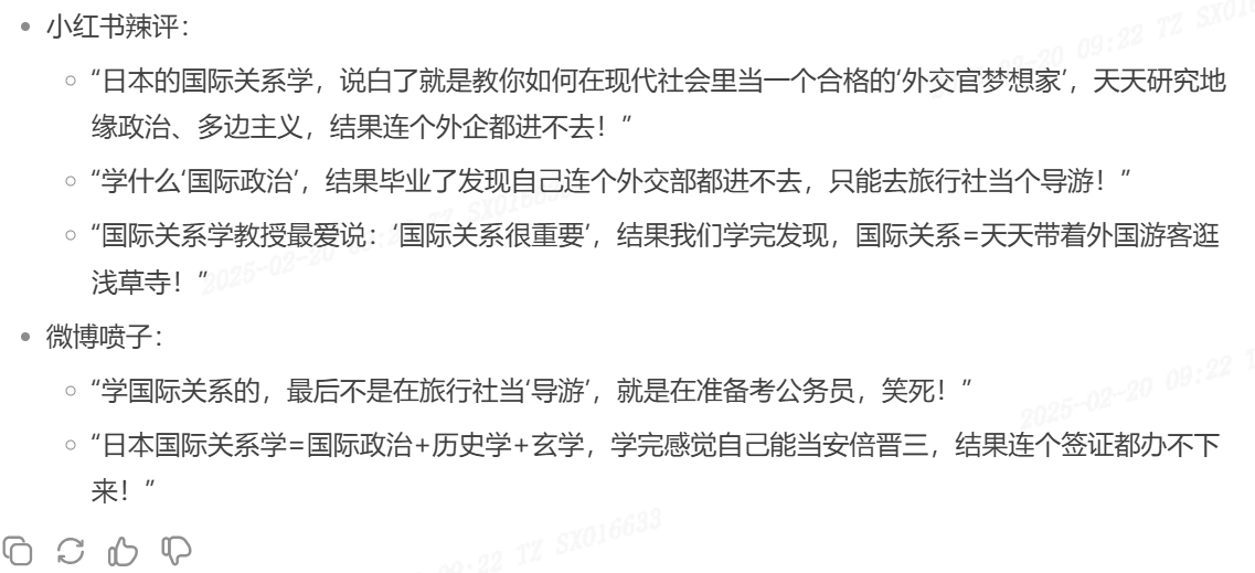 最近爆火的deepseek果然深谙网络喷子的话术?让deepseek分别以小红书的风格和微博的风格锐评日本热门的几个文科专业,真的得到了很多有意思的回答~