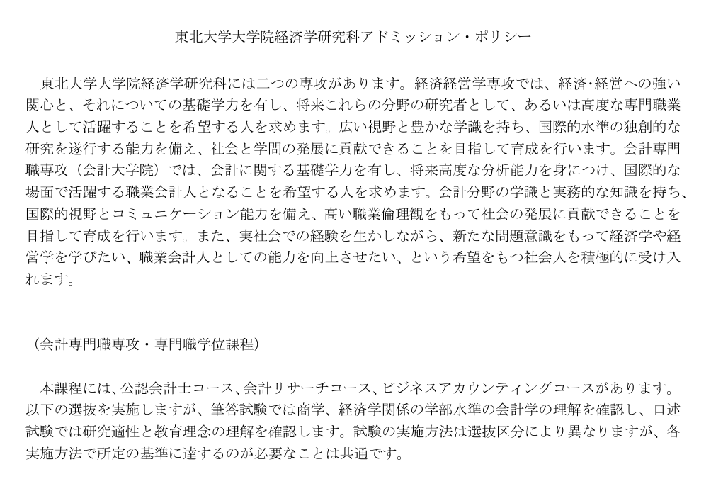 东北大学是7所帝大中唯二设置了会计专门职的学校之一。会计专门职专攻・专门职学位课程下设置有公認会計士コース、会計リサーチコース、ビジネスアカウンティングコース共3个方向,要求考生具备会计学相关的基础知识以及高度的分析能力,专攻旨在培养会计职业领域的专门人才。