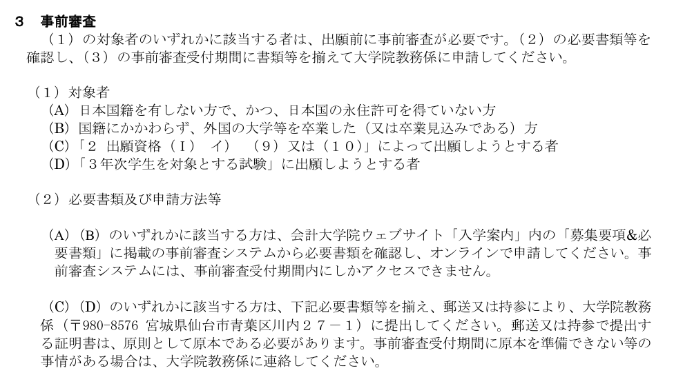 值得注意的是,东北大要求所以外国人考生都必须接受事前审查,如下图所示,留学生们基本都满足条件(A)(B),需要在会计大学院提供的官网上的事前审查网址进行相关资料的登记和提交。