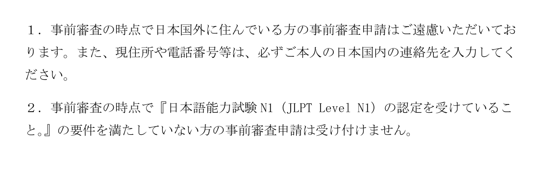 根据学校的要求,接受事前审查的留学生在审查时点必须已经居住在日本,且登记的住所以及电话号码等也必须是本人的实际信息。此外,还要求必须提供N1成绩证明,满足这些条件才能接受事前审查。