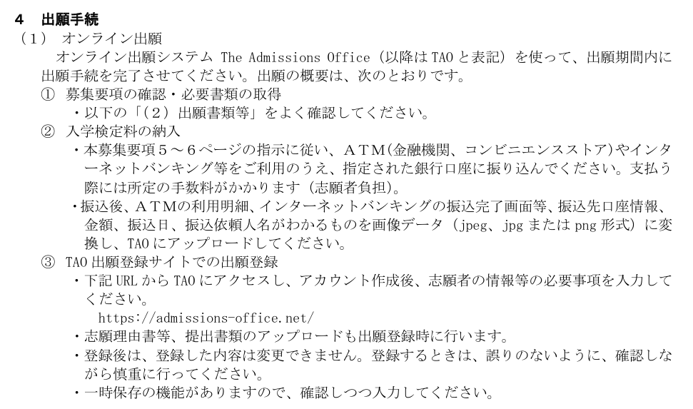 正式出愿也和事前审查一样,全程线上进行。通过学校提供的专用网址进行出愿。具体步骤是:注册信息-缴纳入学检定料-TAO提交书类材料-完成出愿。