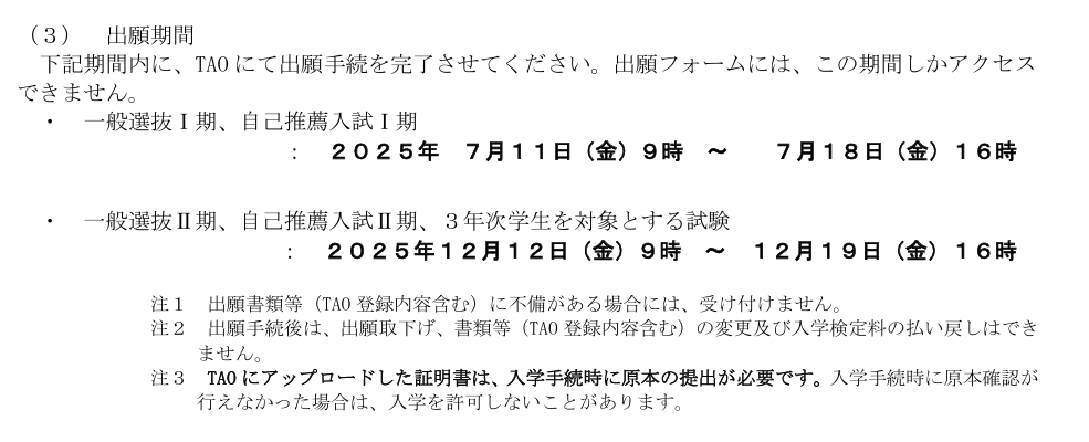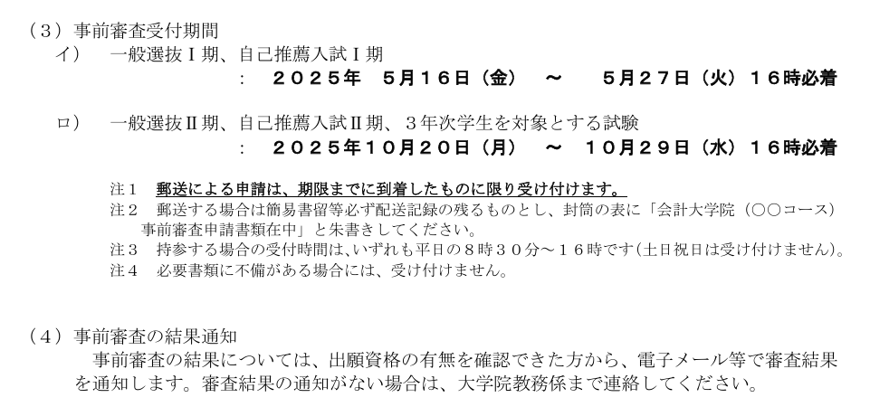 事前审查期间根据夏季入试和冬季入试有所区别,夏季入试的审查期间为2025年5月16日~5月27日,时间比较紧迫,想要出愿的同学需要马上准备了。审查结果会通过同学们登记的电子邮件地址进行通知,审查通过后才能正常出愿。