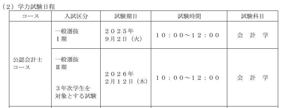根据学校官网公布的过去合格数据,考生基本集中在公認会計士コース,其中2024年度一般入试1期(夏季考)出愿111人,合格32人,合格率约为28.8%,一般入试2期(冬季考)出愿57人,合格8人,合格率约为14.04%,可见夏季考的合格比率较高。