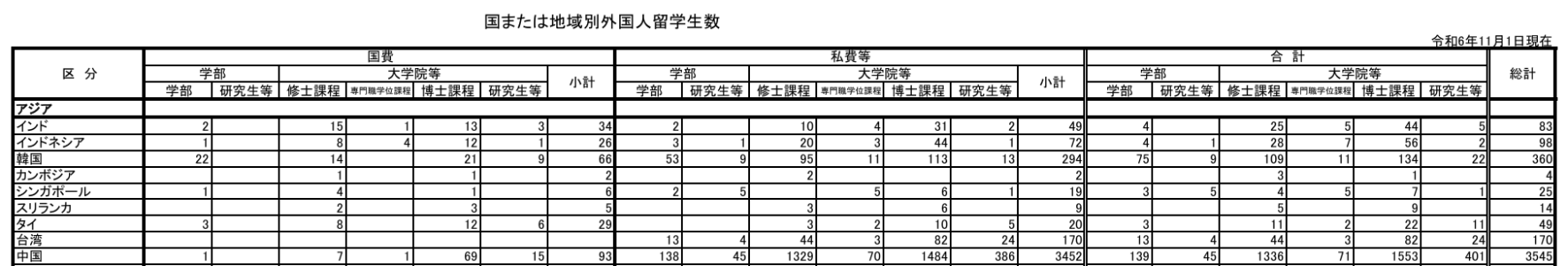 再来看留子们就读的课程,学部(加上研究生等)人数为184名,修士课程1336名,博士课程1553名,中国留学生们几乎都就读修士及以上课程,且博士占比最大!