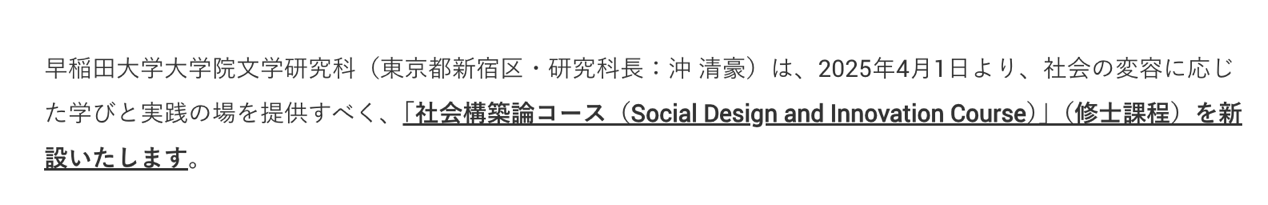 在全球面临多样化社会问题的当下,早稻田大学大学院文学研究科将于2025年4月新设“社会构筑论(Social Design and Innovation Course)”硕士课程,旨在培养具备批判性思维和实践能力的人才,以应对全球和本地社会的复杂挑战。
