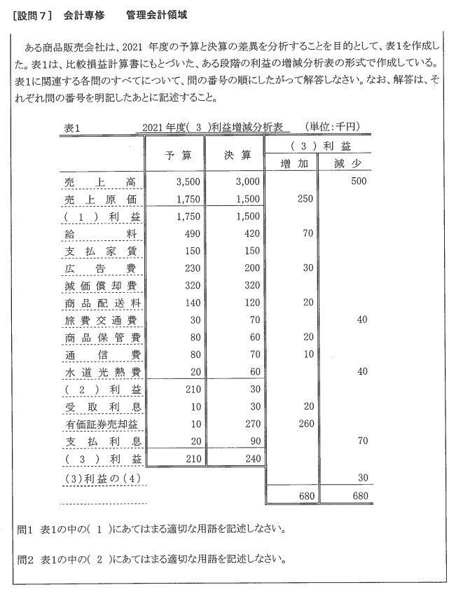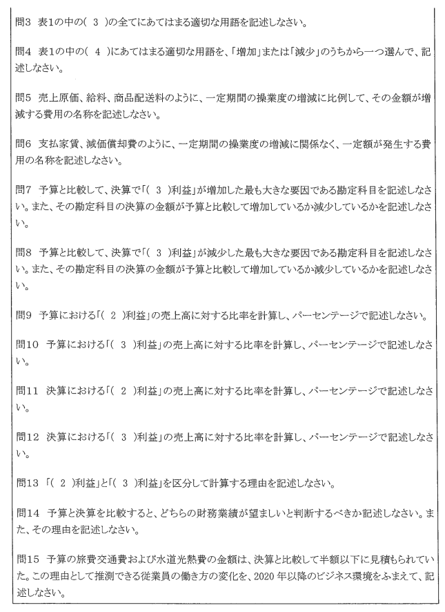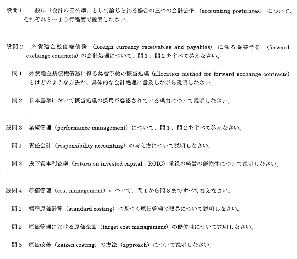 其中,设问1考察会计三公准的内容、设问2考察外貨建金銭債権債務、设问3考察业绩管理以及责任会计的内容、设问4则是探讨原价管理的知识点。总体来看,还是比较偏重知识框架的掌握。
