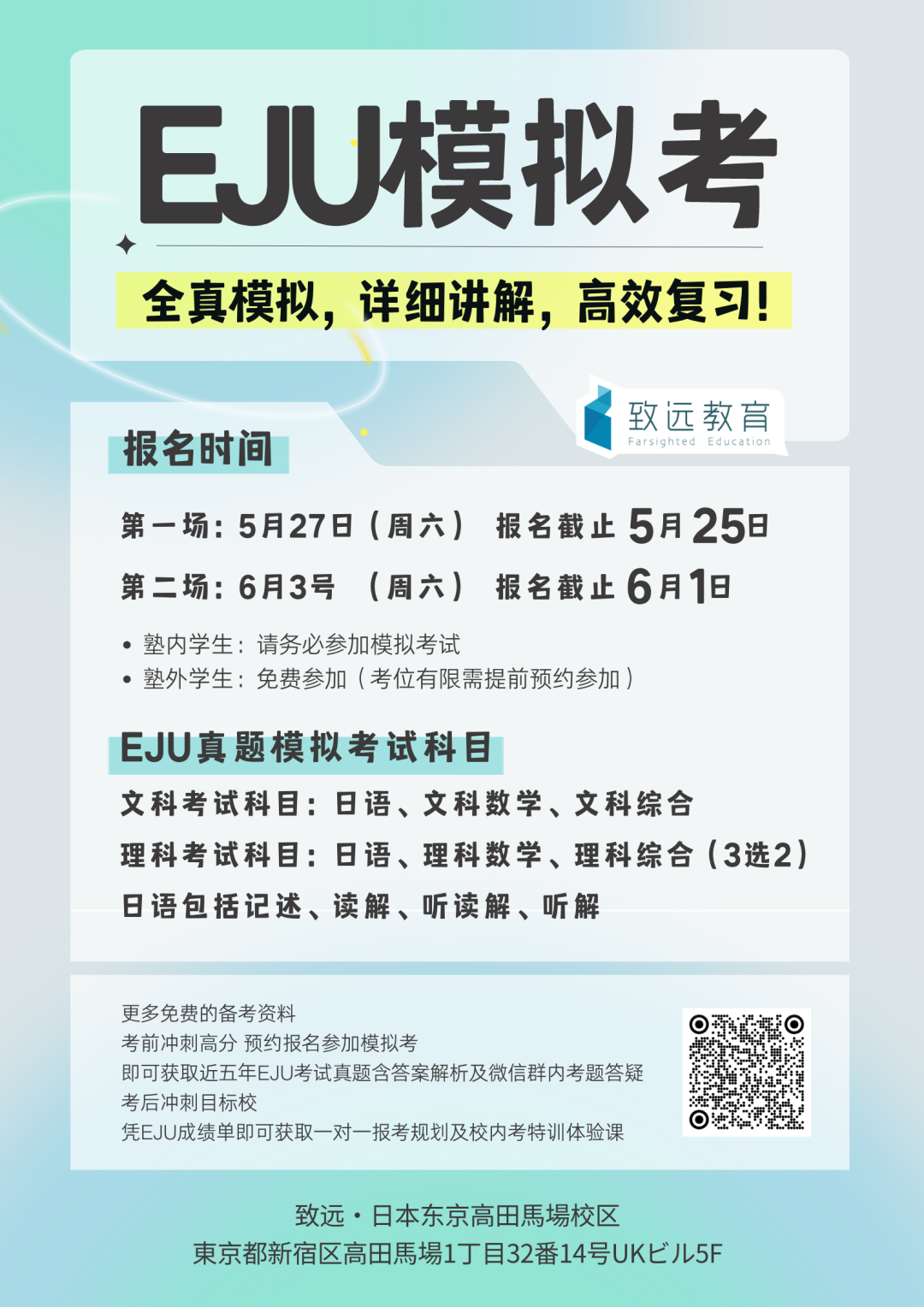 那么,致远教育EJU模拟考来啦!拖延、知识点繁多、题目难度系数大、学习计划难以体系化...以上备考难题,一个对策全解决!针对6月的EJU考试,快速检测自身水平,为最后的复习冲刺奠定方向,查漏补缺、精准复习高效提分