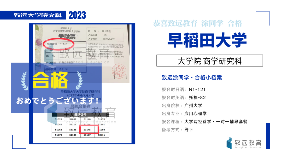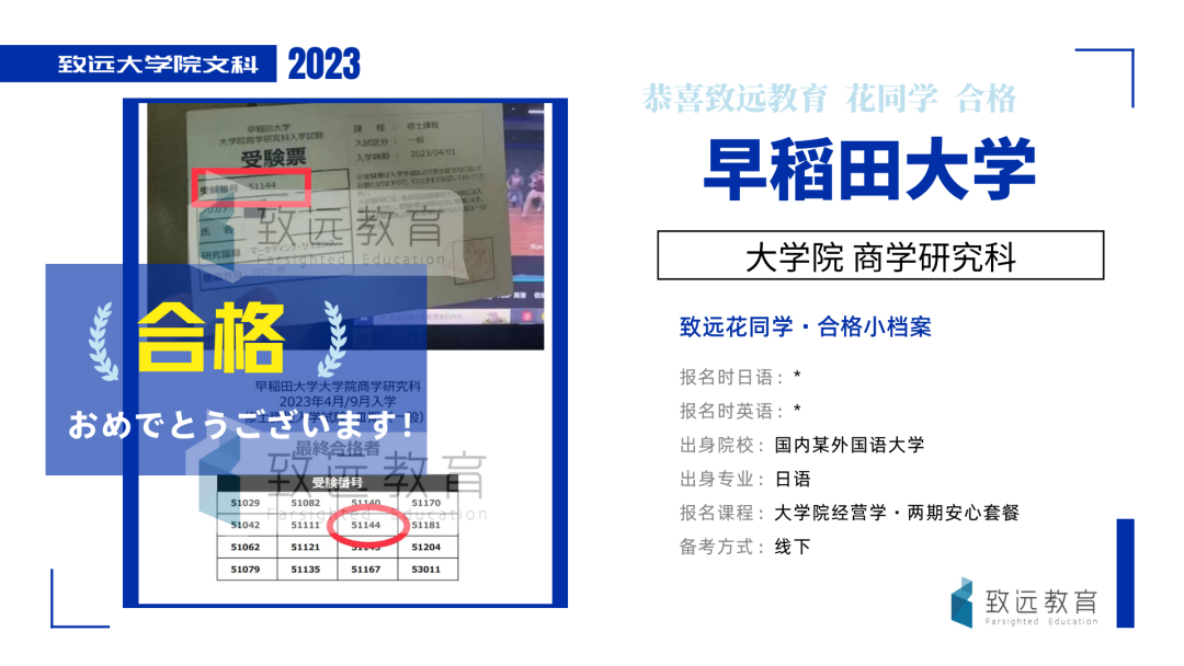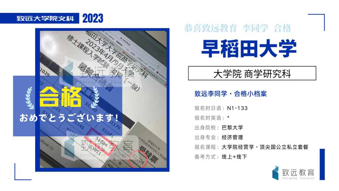 本期合格主要来自于日本顶级私立双雄之一的早稻田大学商学研究科的三份合格!