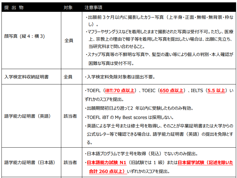 * 需要提交日语N1合格成绩以及英语托福/雅思成绩。